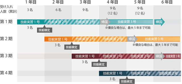 第1号技能実習から第2号技能実習へ、第2号技能実習から第3号技能実習へそれぞれ移行するためには、技能実習生本人が所定の技能評価試験(2号への移行の場合は学科と実技、3号への移行の場合は実技)に合格していることが必要です。 - 受入れ可能人数